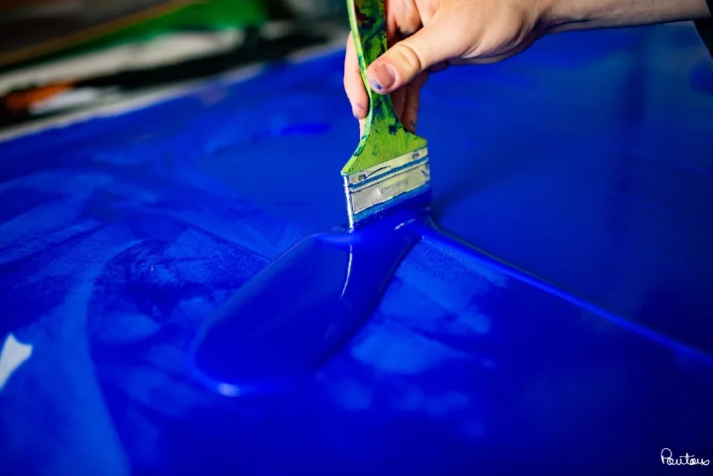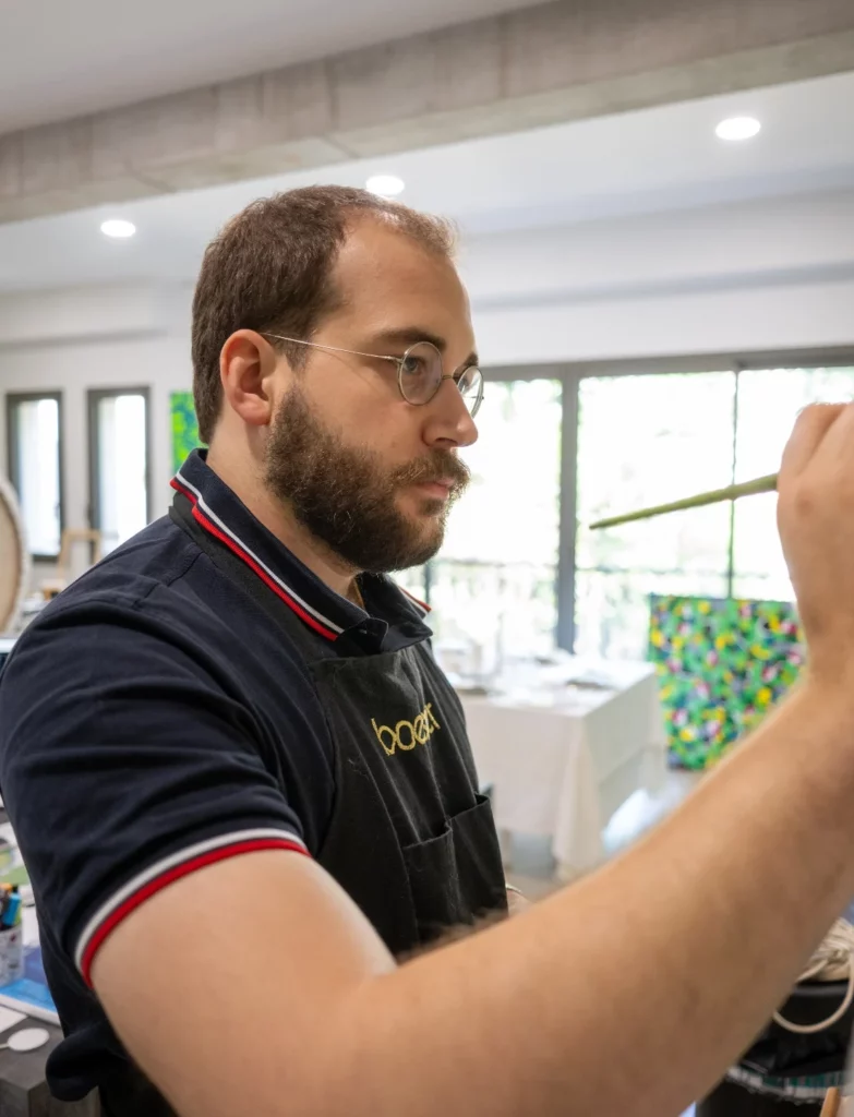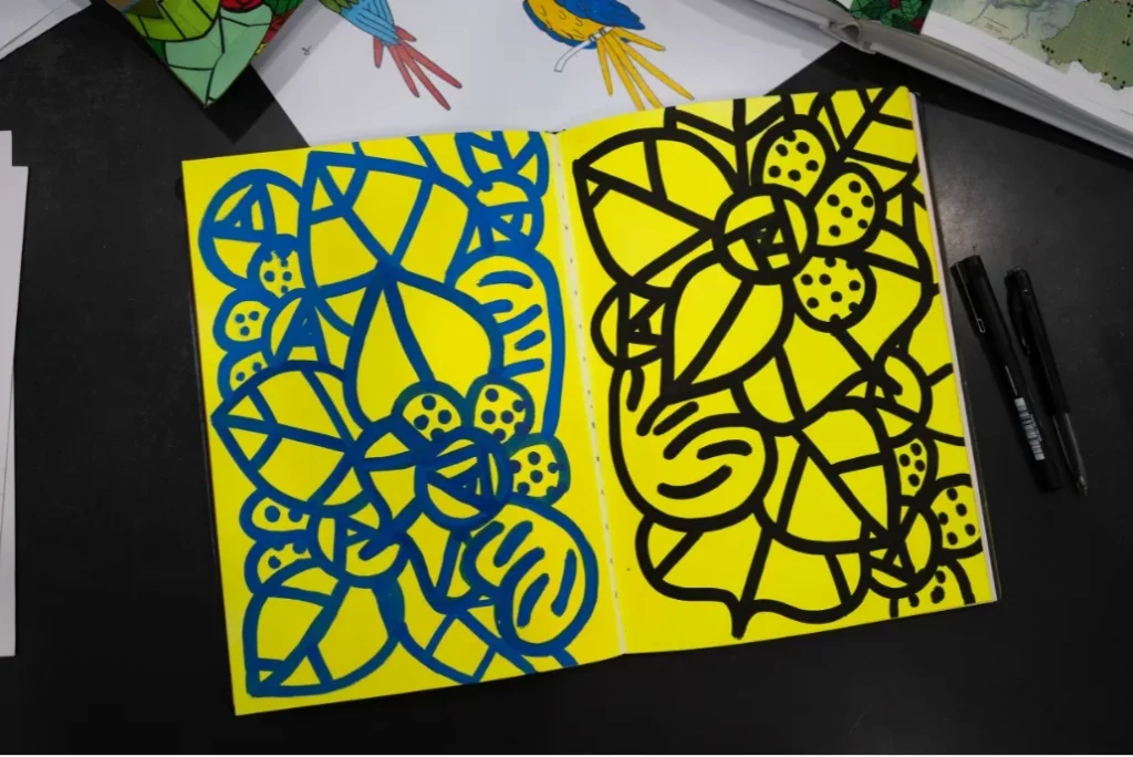 Le motif dentelle est la première grande inspiration de Pierre Guillonneau. Ses premières ébauches, en noir et blanc, posaient les bases de cette recherche esthétique. La dentelle renaît lors du premier confinement, mais cette fois avec un fond bleu profond et un motif doré, directement inspirés des enluminures byzantines. Les couleurs, dotées d’une forte dimension spirituelle, traduisent une quête d’élévation. Le motif, plus épuré, joue sur la profondeur, jusqu’à brouiller les frontières entre fond et forme. Délicat et subtil, il se déploie aussi bien sur de grandes toiles que sur des surfaces plus modestes. Mais la dentelle évolue. BlueMonday marque une première mutation : Pierre Guillonneau abandonne le fond bleu pour un jaune fluorescent, tandis que le trait s’épaissit et adopte un bleu intense. Le motif est agrandi, la dentelle assume alors pleinement son côté pop art. D’autres évolutions sont plus discrètes, comme dans Outrebleu, où le fond se transforme en un dégradé du bleu au noir, donnant l’illusion d’une plongée dans une fosse marine imaginaire.